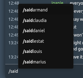 Replies and pings: Any message containing someone’s nickname (the name actually showing beside their messages, which you can change at any time) will highlight for them/notify them if they have notifications turned on. So only say nice things when you’re gossiping. There is no one-click method to reply directly to a specific message in IRC; instead, you should just start your reply with the nick of the person you want to reply to in a busy conversation. If you need to specify which specific message, copy/paste a bit of it inside of > < or something. A kind person has actually written me a piece of javascript to automate this process, I just haven’t figured out how to actually… put it in the thing yet.