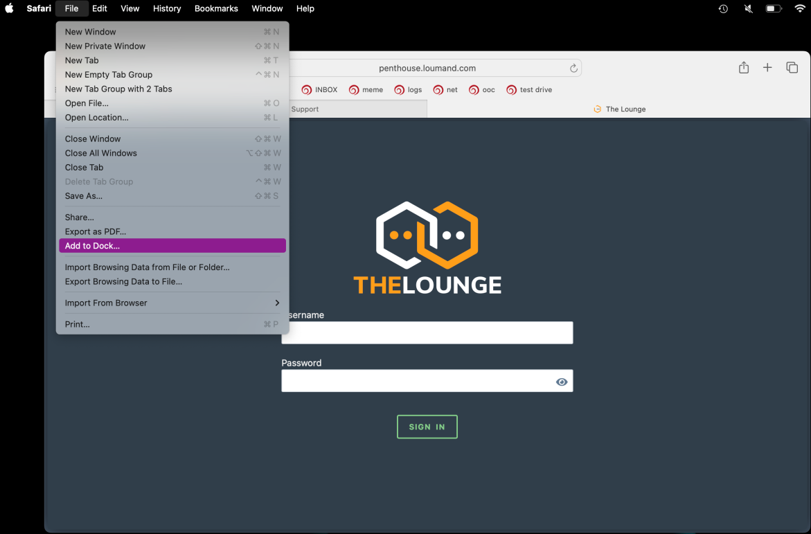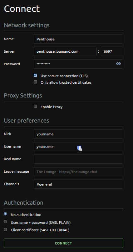 A: Sure! You’ll need the general server password, which can be obtained from tei, or if you already have a login to the thelounge client, by right-clicking on the penthouse server tab, editing the network, and showing the password in the Network Settings field.