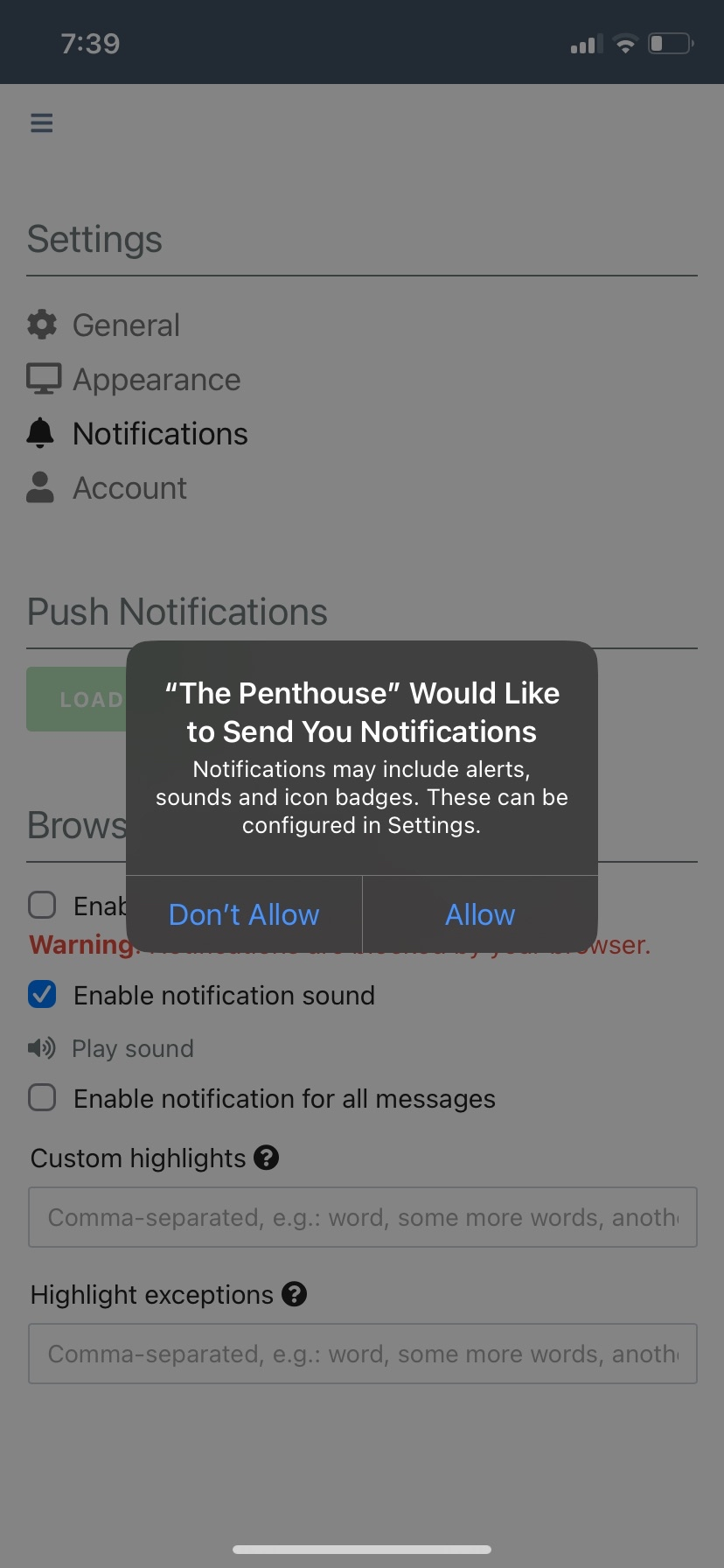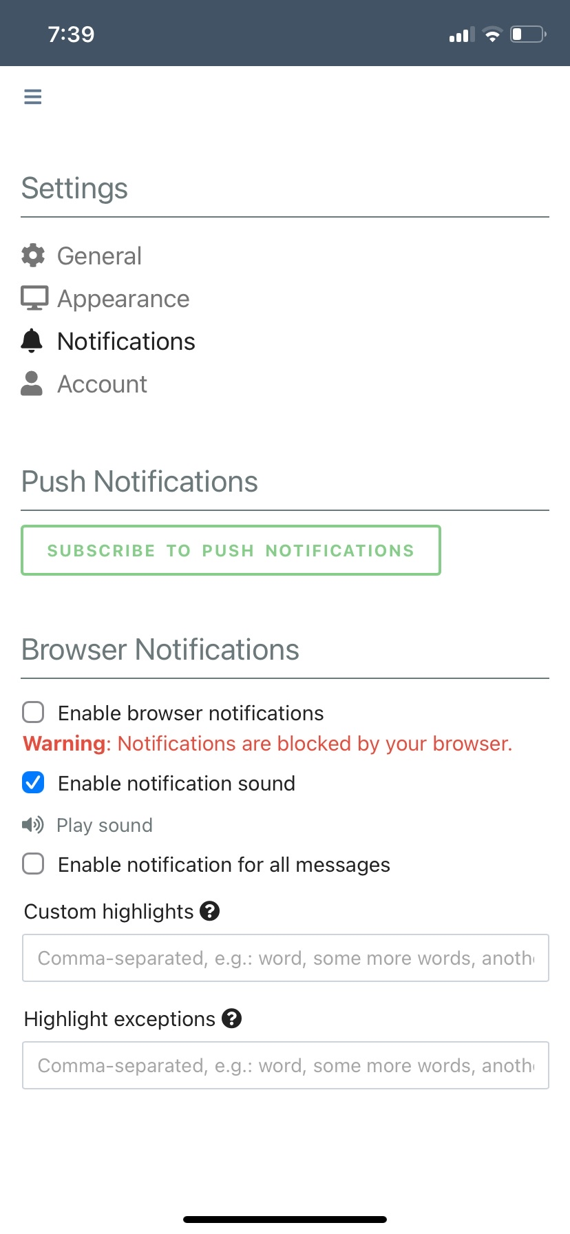 If you would like push notifications on your device, go back to the gear in the bottom left, and go to Notifications. Click the green button: